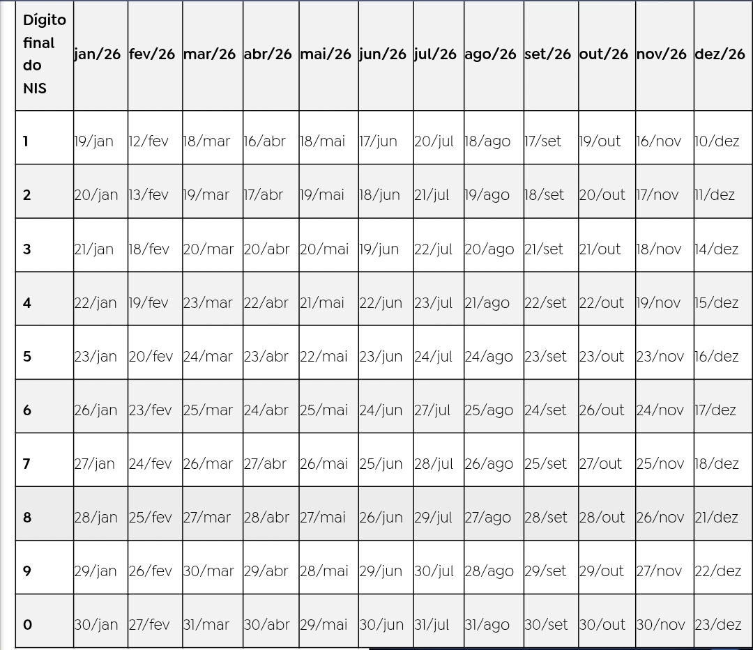 Os pagamentos ocorrerão nos últimos dez dias úteis de cada mês, de forma escalonada conforme o dígito final do Número de Inscrição Social (NIS), exceto em dezembro, quando o cronograma é antecipado em cerca de uma semana por causa do Natal.