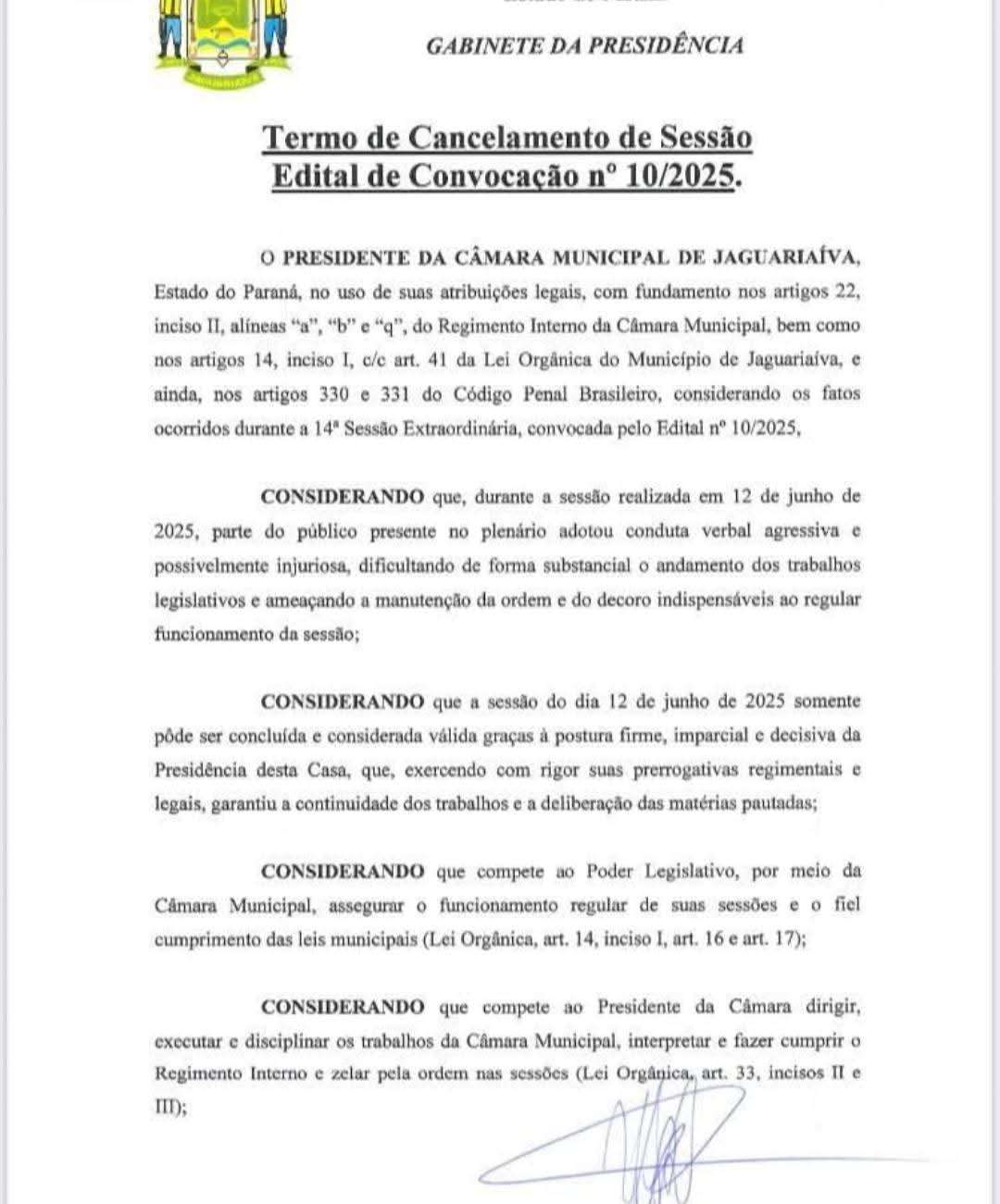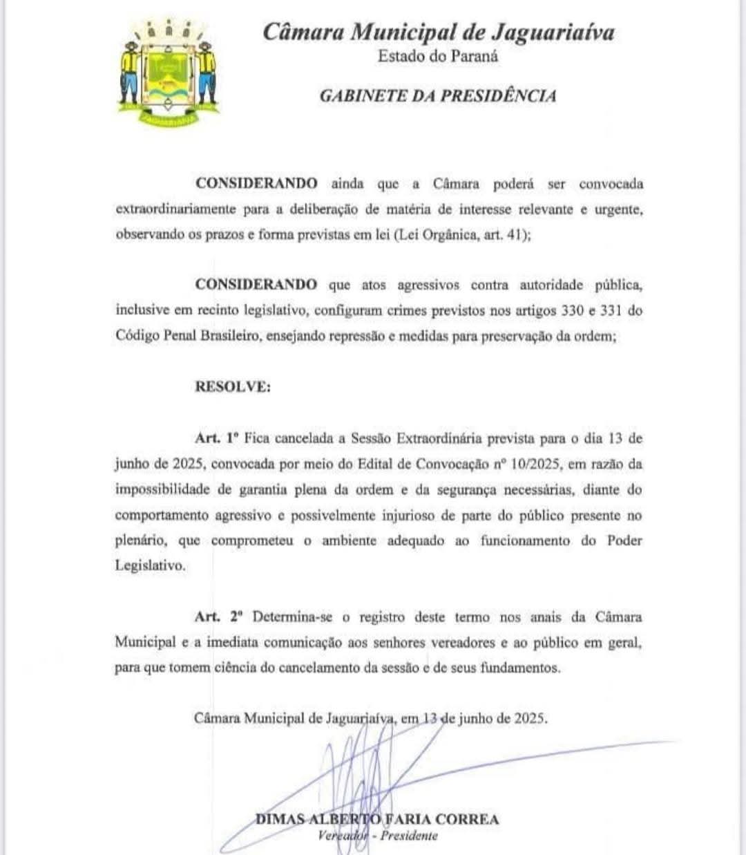 Após a polêmica da votação de ontem na Câmara de Vereadores de Jaguariaíva, quinta-feira (12), sobre o aumento do vale-alimentação dos parlamentares , o presidente da casa legislativa cancelou a sessão desta sexta-feira (13), sobre o argumento que os protestos ocorridos na última votação foram violentos, como pode-se observar no termo de cancelamento