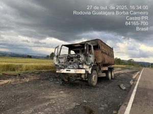 Um caminhão Ford Cargo 2425, com placas de Castro, foi atingido por um incêndio enquanto transitava pela PR-340, no km