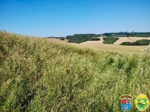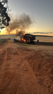 Uma colheitadeira Massey Ferguson 9595, equipada com plataforma Draper de 25 pés, foi completamente destruída por um incêndio na tarde