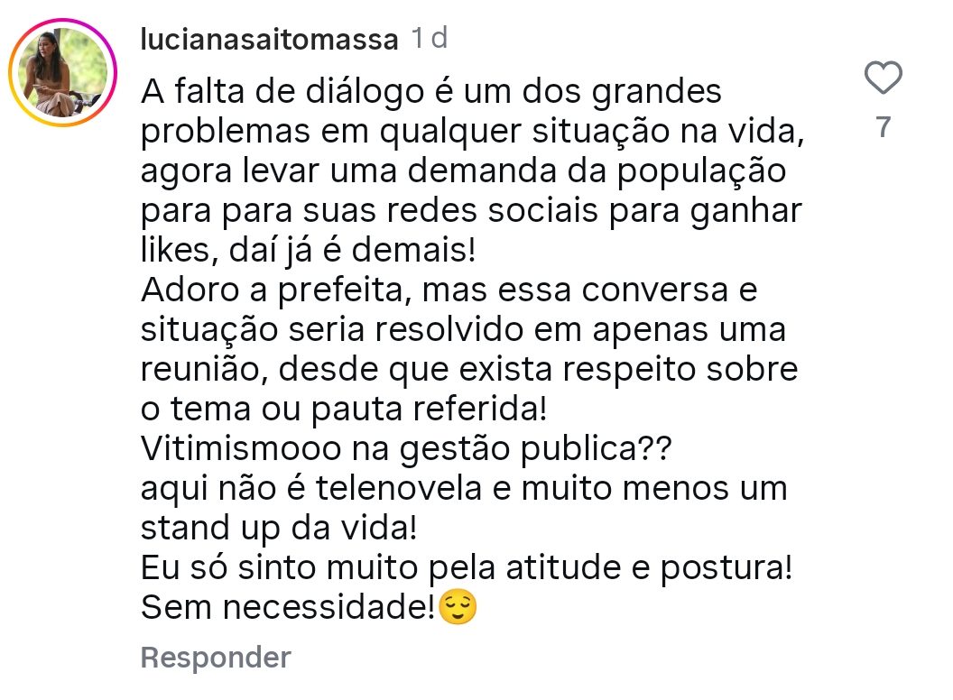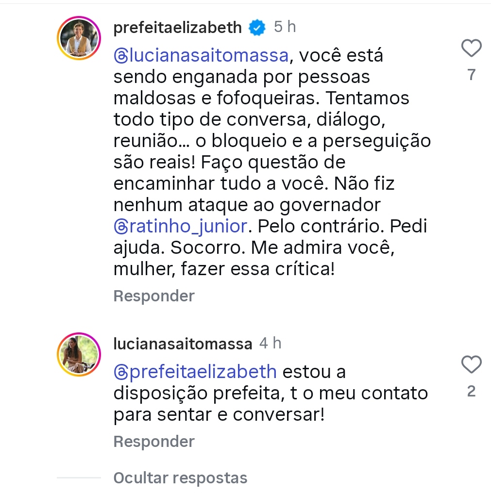 Porém, a briga começou quando a primeira-dama do estado, Luciana Saito Massa comentou no post e disse que a prefeita fazia vitimismo na gestão pública.
