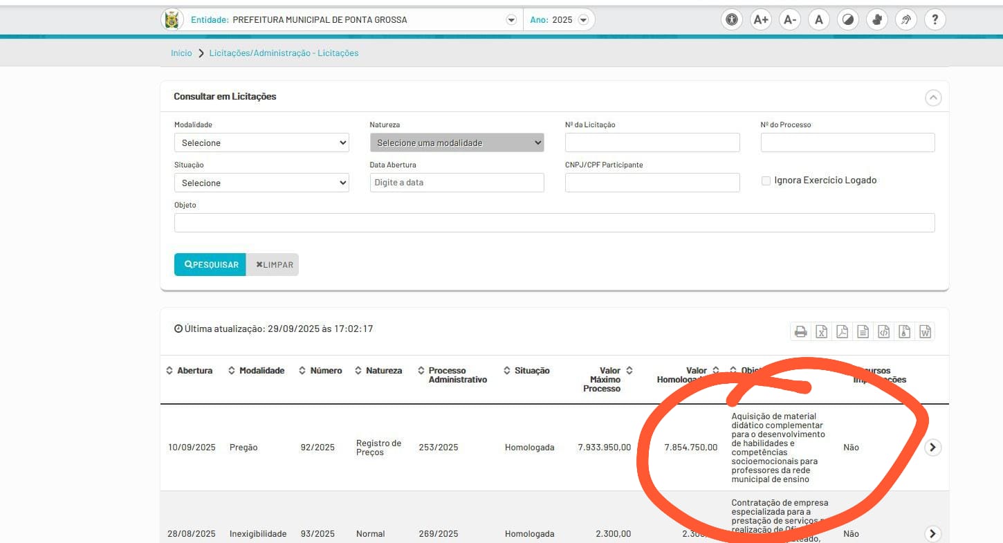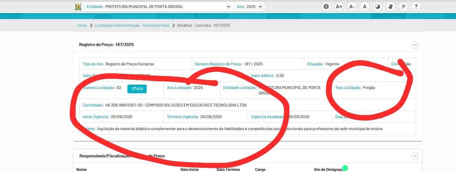 Segundo informações, o primeiro kit seria para o desenvolvimento de habilidades e competências socioemocionais para professores da rede municipal de ensino.  E o meio pelo qual a Prefeitura Municipal de Ponta Grossa, através da Secretaria Municipal de Educação escolheu para contratar esse serviço da empresa Compass Soluções em Educação e Tecnologia LTDA foi pelo tipo Licitação Pregão, o que não estaria de acordo com a lei vigente.