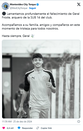 O time Montevideo City Torque lamentou a perda do jovem goleiro: “Acompanhamos seus familiares, amigos e colegas neste momento de tristeza para todos nós. Adeus, Geral”, publicou o clube.