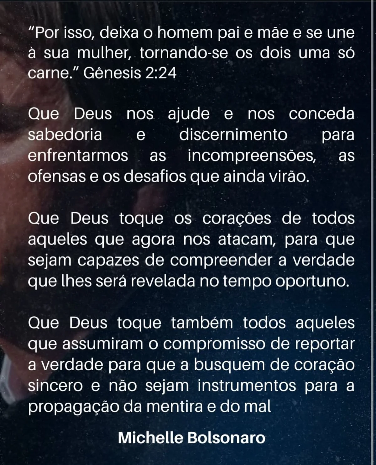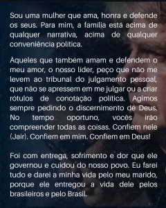 Na postagem inicial, Michelle afirma “estar unida às suas filhas e aos enteados” para cuidar de Bolsonaro e cita que não houve tentativa de golpe.