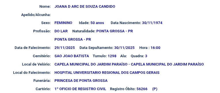 No dia em que completaria 51 anos, Joana Darc de Souza Candido, será sepultada após não resistir a duas paradas cardiorrespiratórias. A vítima estava internada na Unidade de Terapia Intensiva (UTI) do Hospital Universitário Regional dos Campos Gerais.