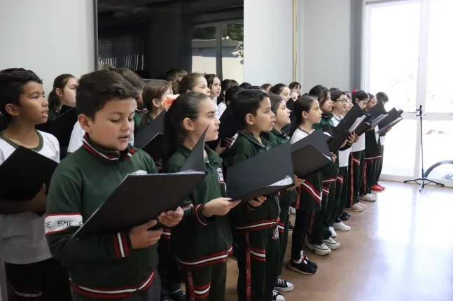 Na manhã desta sexta-feira (7), o Coral da Escola Maria Flora Scaramella Moreira esteve no Paço Municipal da Prefeitura de
