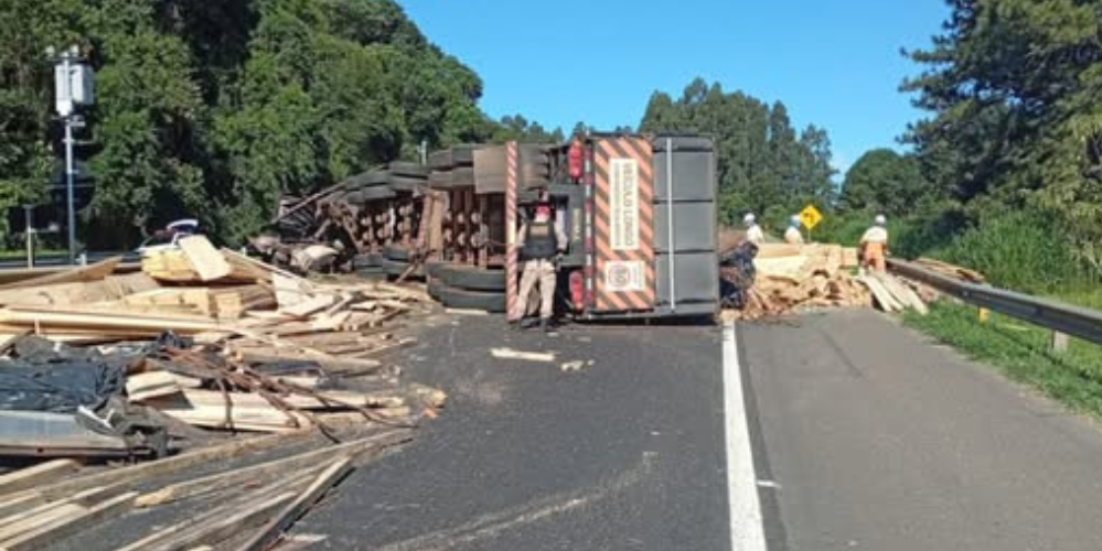 Um caminhão carregado com tábuas de pinus tombou na tarde deste sábado (28) na PR-151, no trecho entre os municípios