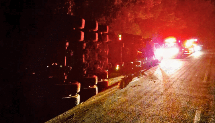 Um caminhão tombou na madrugada desta quinta-feira (19), por volta das 4h30, na PR-090, no km 162+700, no trecho entre