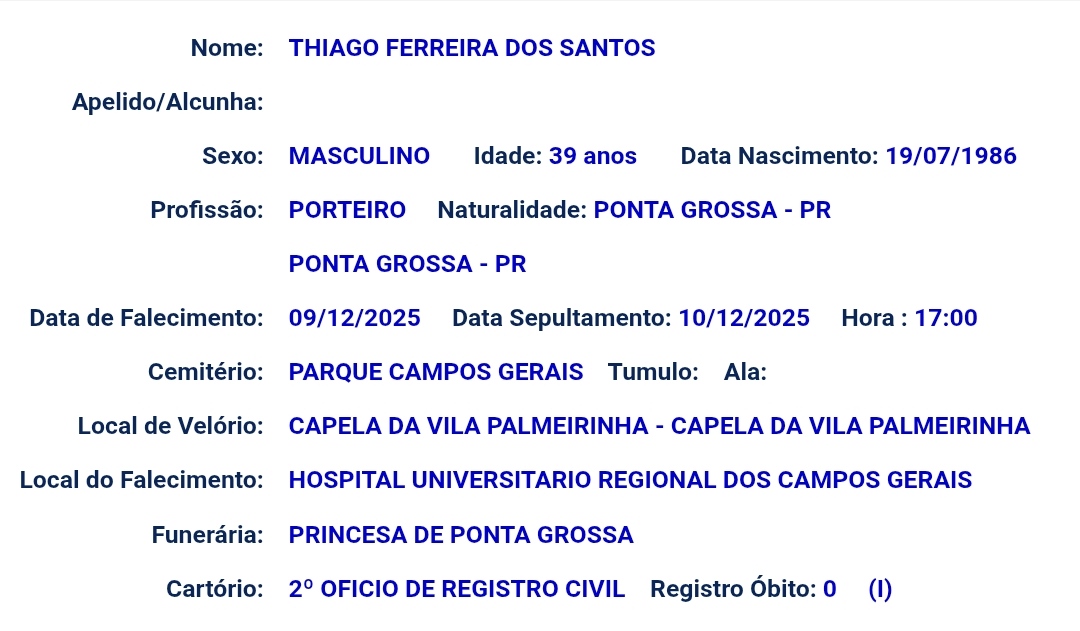 O porteiro, Thiago Ferreira dos Santos, de 39 anos, que morreu após ser atingido por uma peça de caminhão em um grave acidente na PR-438, em Ponta Grossa, na manhã de ontem, será sepultado na tarde desta quarta (10).