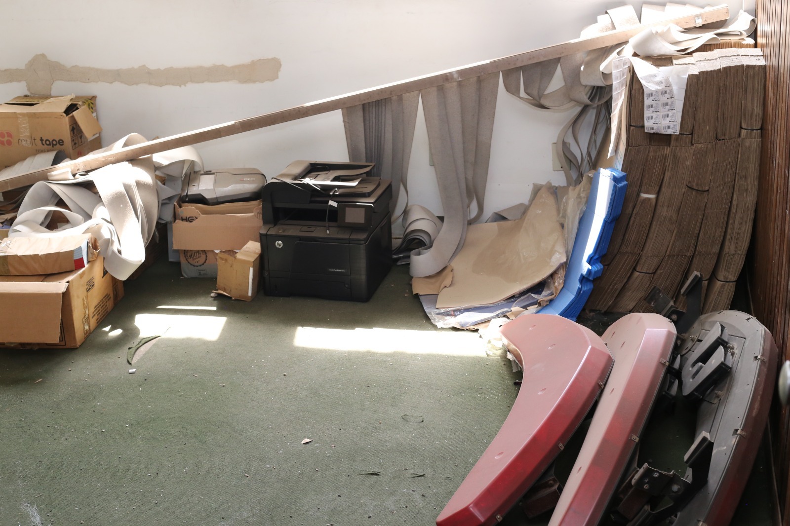 Forros destruídos, cortinas estragadas, móveis deteriorados, entulho e dezenas de caixas cheias de documentos antigos espalhadas pelas salas compõem o cenário encontrado pela equipe da Prefeitura na antiga Câmara Municipal no Centro de Castro.