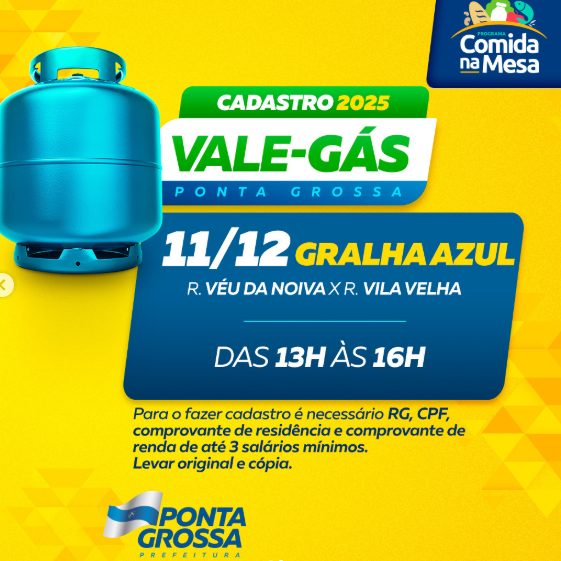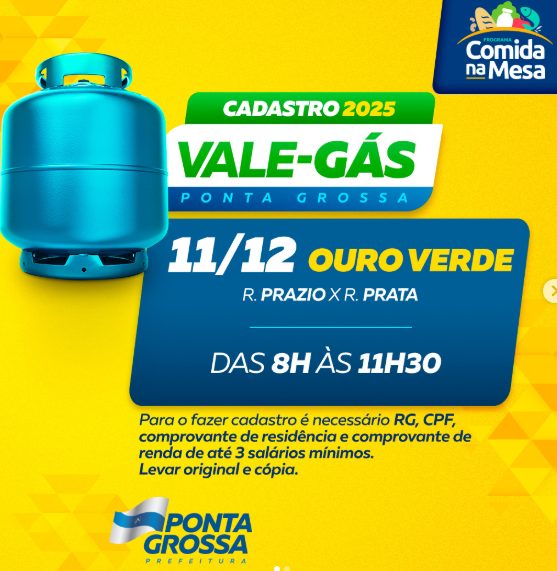 O cadastro para o ‘Vale Gás’ com validade para o ano de 2025 está sendo realizado de forma presencial nos pontos do Feira Verde em todos os bairros de Ponta Grossa.