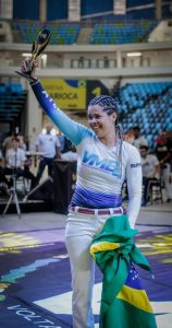 A atleta Janaely Gata destaca o impacto fora das arenas: “A gente aprende que capoeira também é projeto, planejamento e relacionamento.”